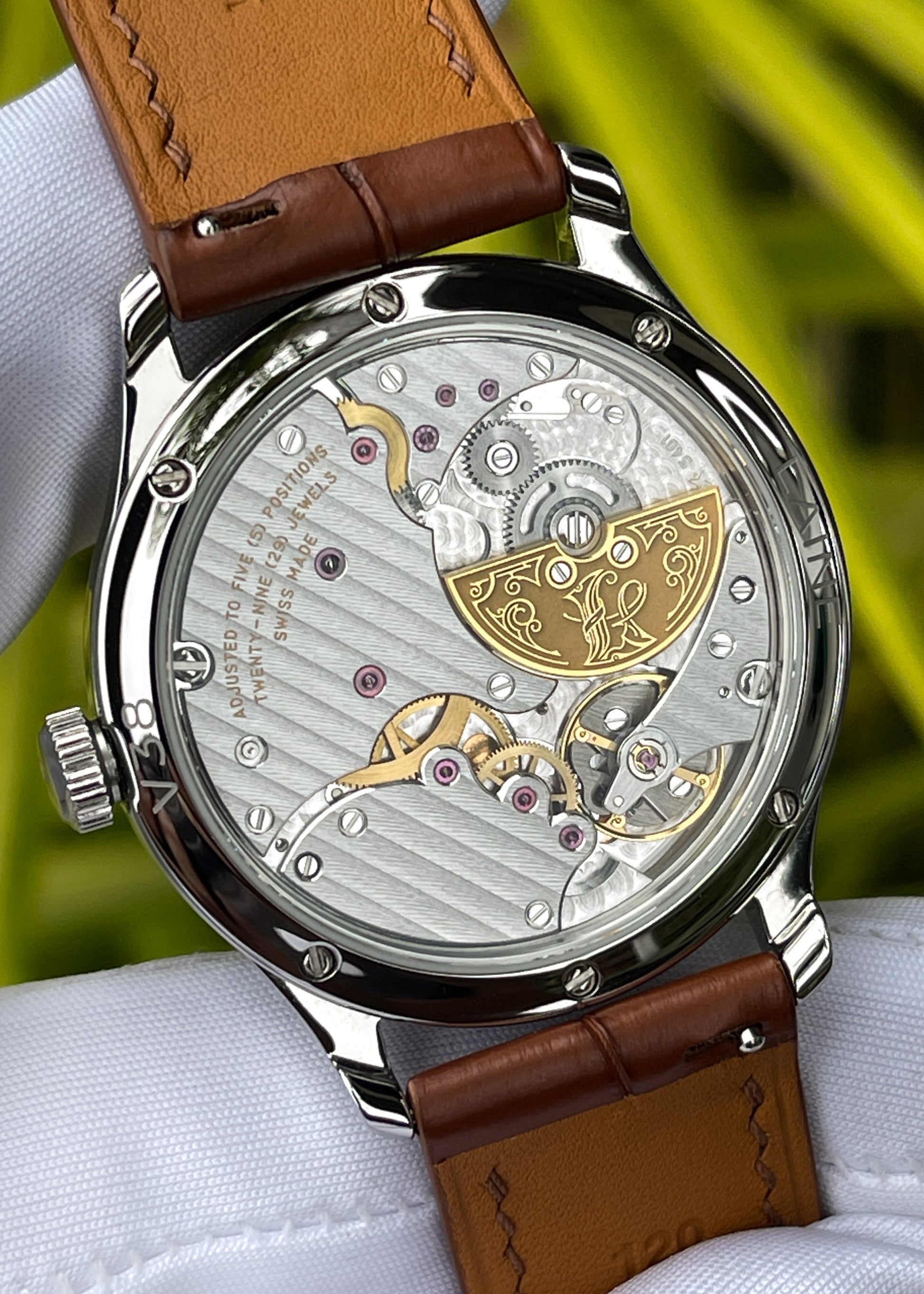 The V38 features a Vaucher 5401 caliber with a plated tungsten micro-rotor for efficient automatic winding. The movement is nicely finished and runs at 3HZ with a 48 hour reserve.