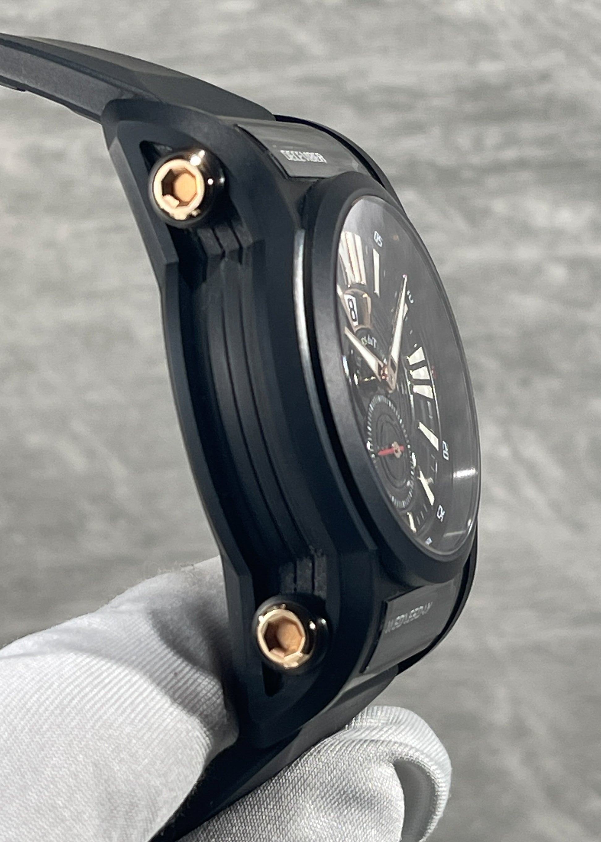 Here we have an estate Chapter 2 TCR (Triple Round Calendar), which despite its 45mm case size is very wearable with its DLC coated Titanium case and rose gold components which serve to tie in the dial and lovely rose gold rotor. Fitted to an adjustable MdT rubber strap and DLC deployant buckle.