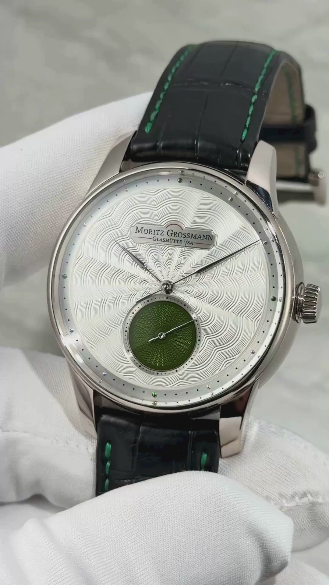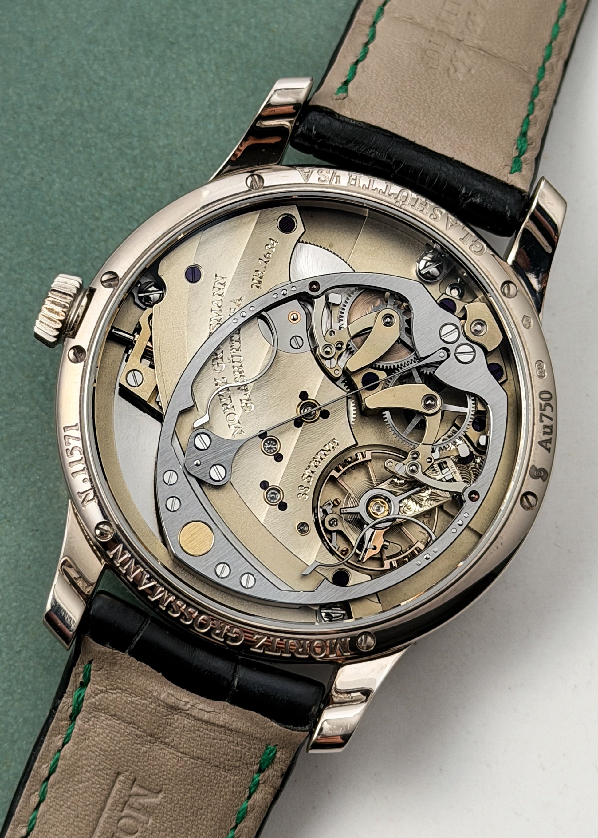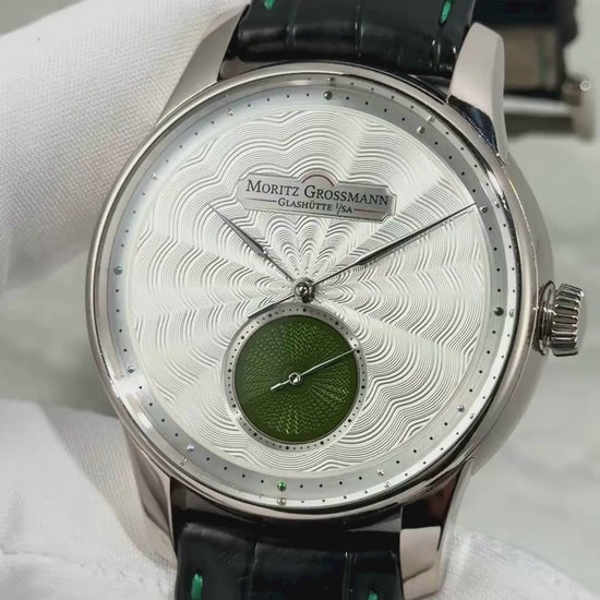 The 18 karat white gold case measures 41mm x 11.8mm x 50.5mm lug-to-lug. The watch is furnished on an OEM black alligator strap with dark green stitching and 18 karat white gold Moritz Grossmann pin buckle. Complete with Box, Loupe, and Papers dated August 30th, 2020.