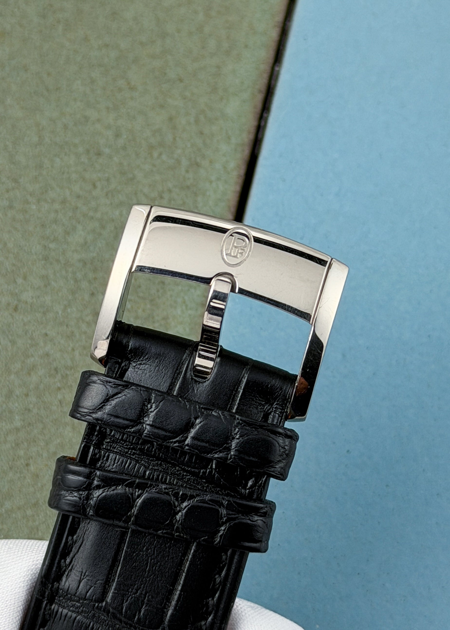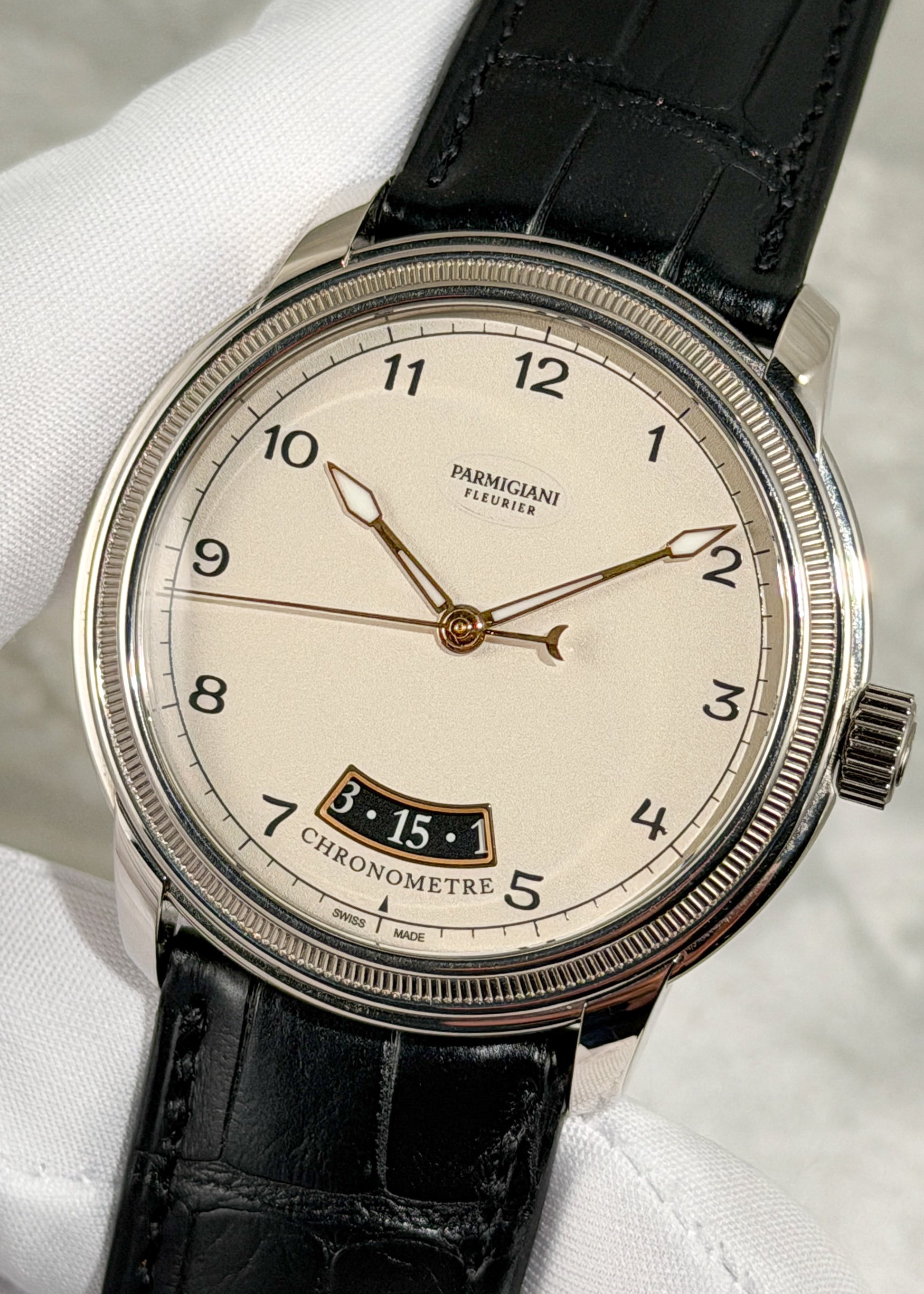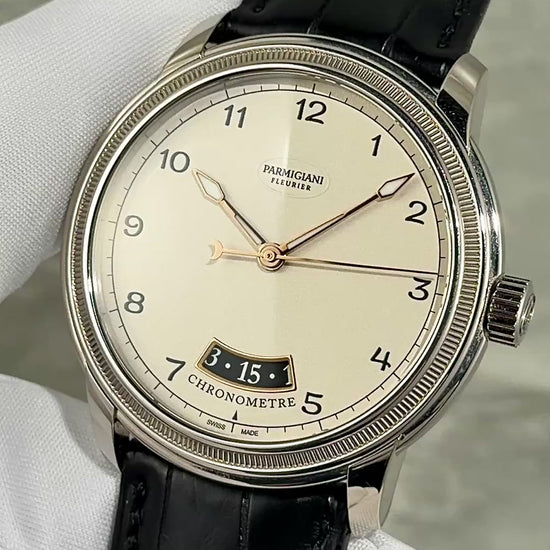 The 18 Karat White Gold case measures 40.8mm x 9.1mm x 44.5mm lug-to-lug and is in excellent condition. Furnished on an OEM/Hermes black alligator strap with 18k white gold Parmigiani Fleurier pin buckle. Complete with Box & Papers dated 2/11/2025.