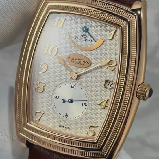 The 18k Rose Gold case measures 44mm long x 35mm wide (not including crown) and 11.5mm thick and is in excellent condition. The watch is attached to a brand new burgundy strap from DeLugs with gold plated steel buckle in addition to an original Parmigiani Fleurier 18k Rose Gold Deployant buckle… a very rare and expensive find! Furnished with Papers dated 2002, no box is included.