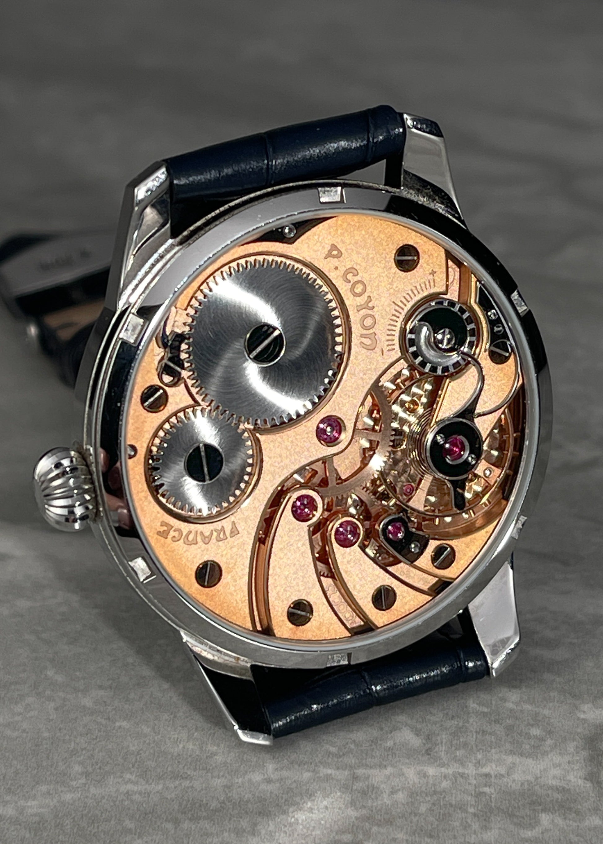 The pure artistry of Pascal Coyon is on full display with this exceptionally finished dress watch. The "Series 1" was comprised of 60 stainless steel timepieces, divided into three different colors of plating (rose, yellow, rhodium) of the bridges and baseplates. Here we have my personal favorite, rose gold, offering a gorgeous contrast to the large steel components which have either received black polish or other traditional finishing techniques.