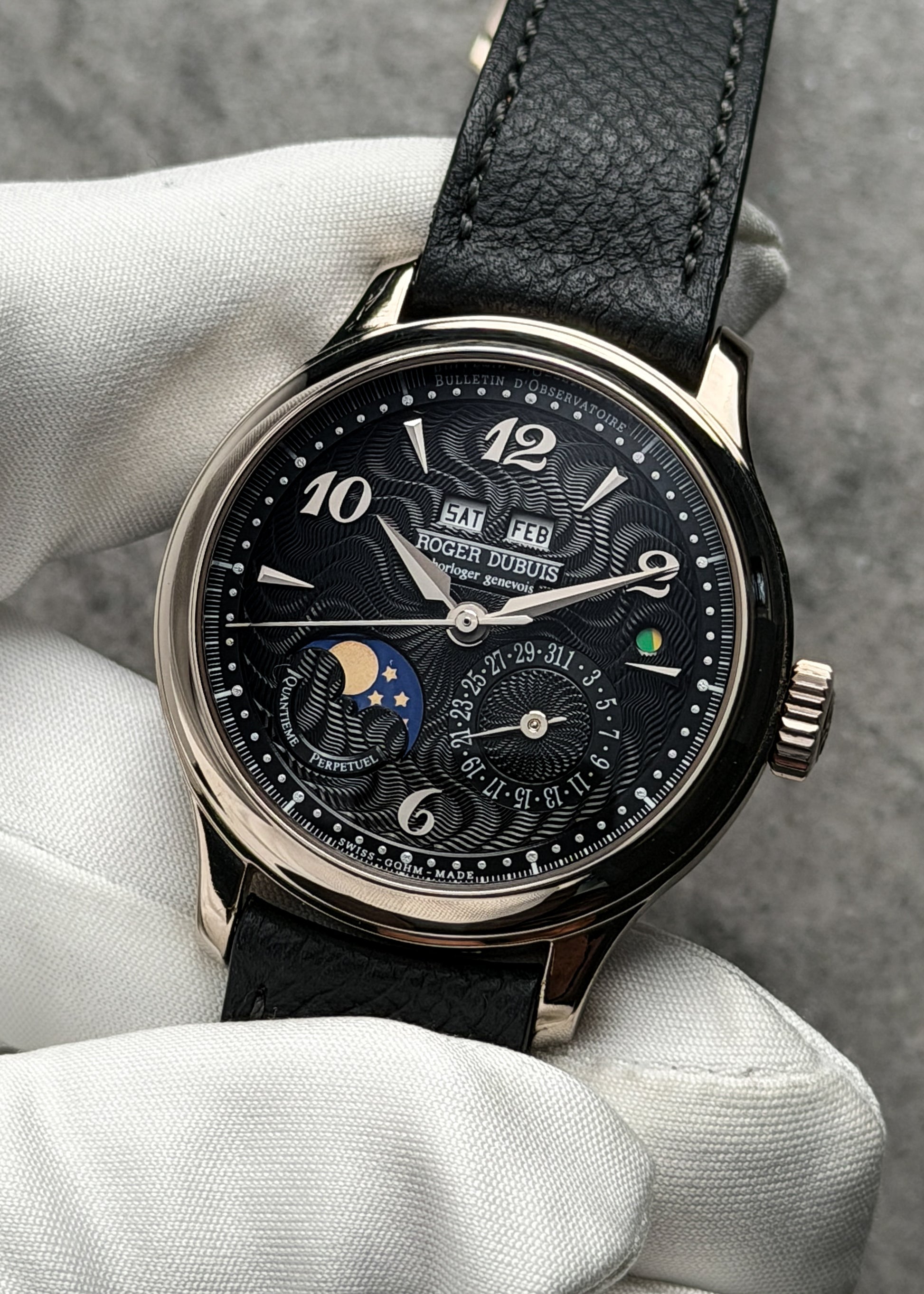 Underneath the faceted white gold alpha-shaped hands lies a gorgeous black dial with wavy guilloché pattern and applied white gold Breguet numerals and arrowhead indices. Apertures in the dial reveal the day, month, moonphase and leap year cycle of the perpetual calendar while the date exists in a subdial at the 4 o'clock position.