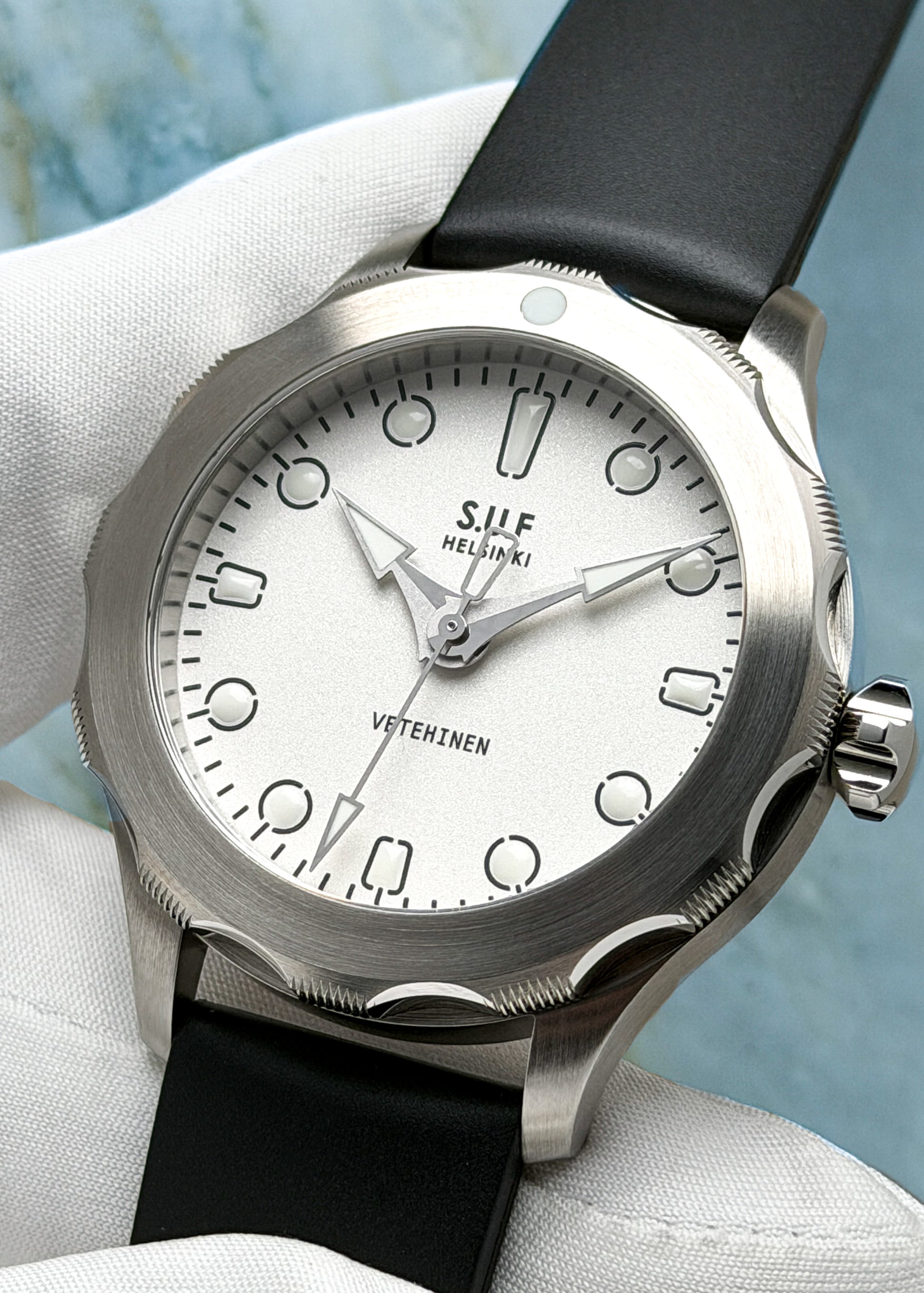 S.U.F Helsinki's Vetehinen line of timepieces brings both Finland’s mythological water spirit and the legendary WWII submarine back to life. This newly released Mark 2 version features a slimmer case design and a solid steel caseback, giving it a tougher, more raw look - just the way Stepan likes it. It still carries that unmistakable Sarpaneva DNA: bold hands, signature crown, and "gear-like" rotating bezel.