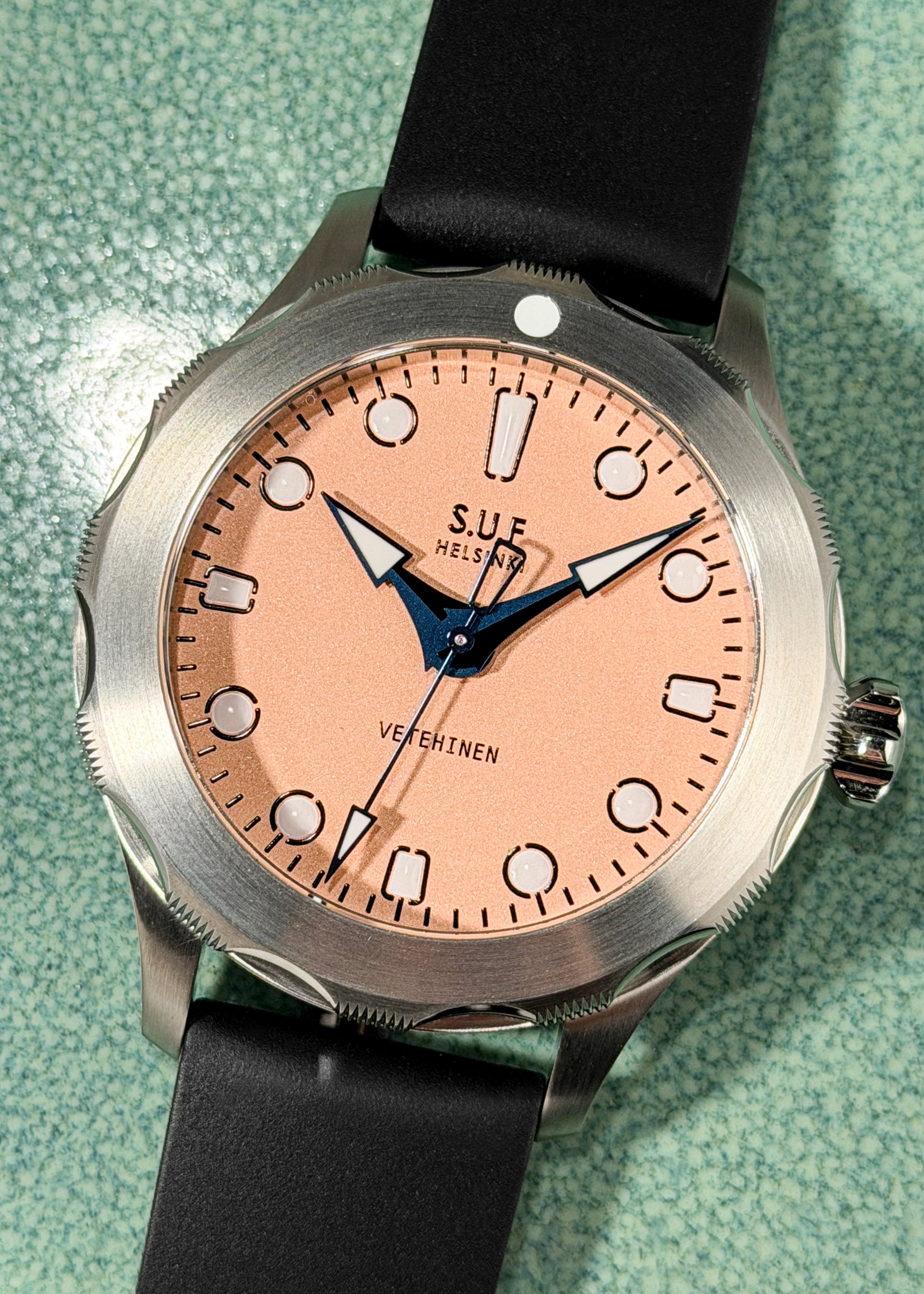 S.U.F Helsinki's Vetehinen line of timepieces brings both Finland’s mythological water spirit and the legendary WWII submarine back to life. This newly released Mark 2 version features a slimmer case design and a solid steel caseback, giving it a tougher, more raw look - just the way Stepan likes it. It still carries that unmistakable Sarpaneva DNA: bold hands, signature crown, and "gear-like" rotating bezel.
