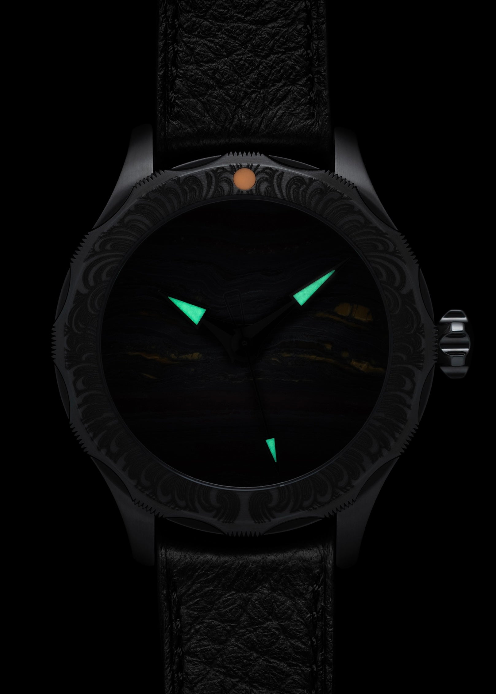 Similar to previous Vetehinen, this Special Edition still carries that unmistakable Sarpaneva DNA: bold hands, signature crown, and "gear-like" rotating bezel with Mo Coppoletta tattoo-inspired engraving. The incredibly tactile unidirectional bezel featuring serrated edges at 5 minute intervals for amazing grip. The large round pip on the bezel is filled with Superluminova to match the luminous hands.