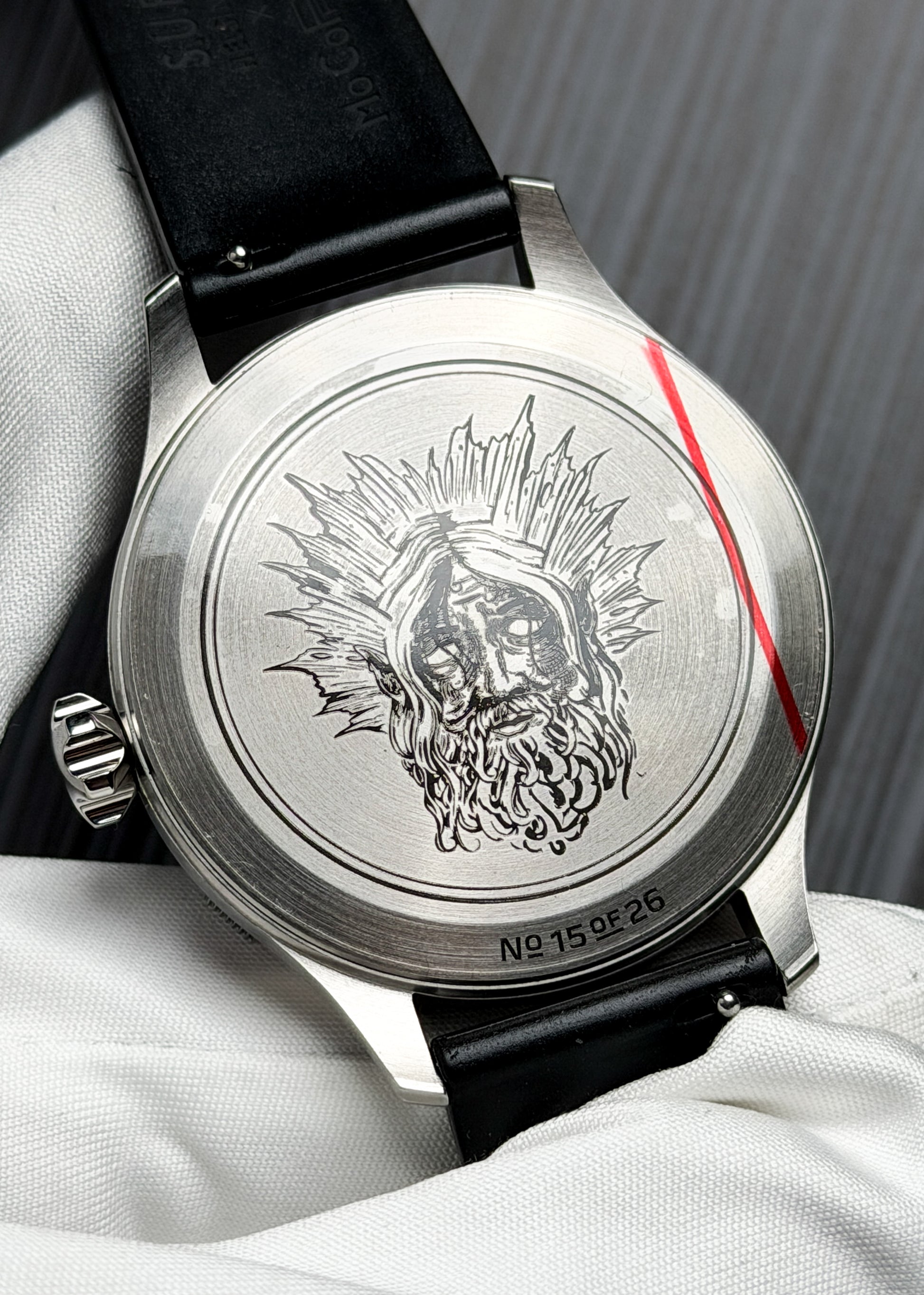 Similar to previous Vetehinen, this Special Edition still carries that unmistakable Sarpaneva DNA: bold hands, signature crown, and "gear-like" rotating bezel with Mo Coppoletta tattoo-inspired engraving. The incredibly tactile unidirectional bezel featuring serrated edges at 5 minute intervals for amazing grip. The large round pip on the bezel is filled with Superluminova to match the luminous hands.