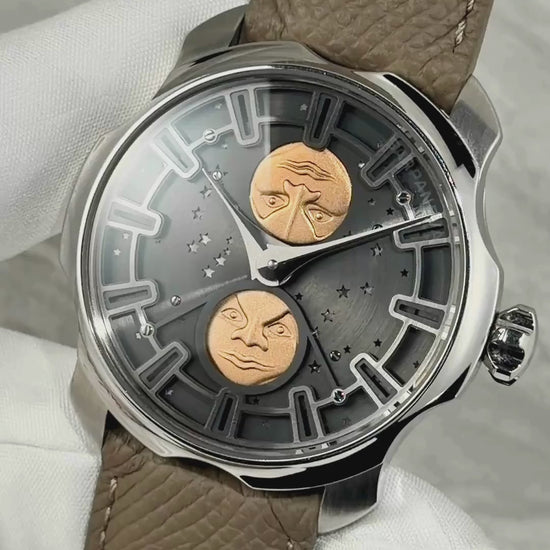 For his iconic moon phase watches, Stepan modifies the quick set calendar mechanism of the Soprod A10 caliber to work perfectly as a moon phase complication. Stepan introduces a wheel with 59 teeth (two teeth for each day of the 29.5 day cycle) in place of the date wheel which ordinarily has 31 teeth. He then takes added steps to ensure the mechanism will not break should the hands move in an anti-clockwise direction.