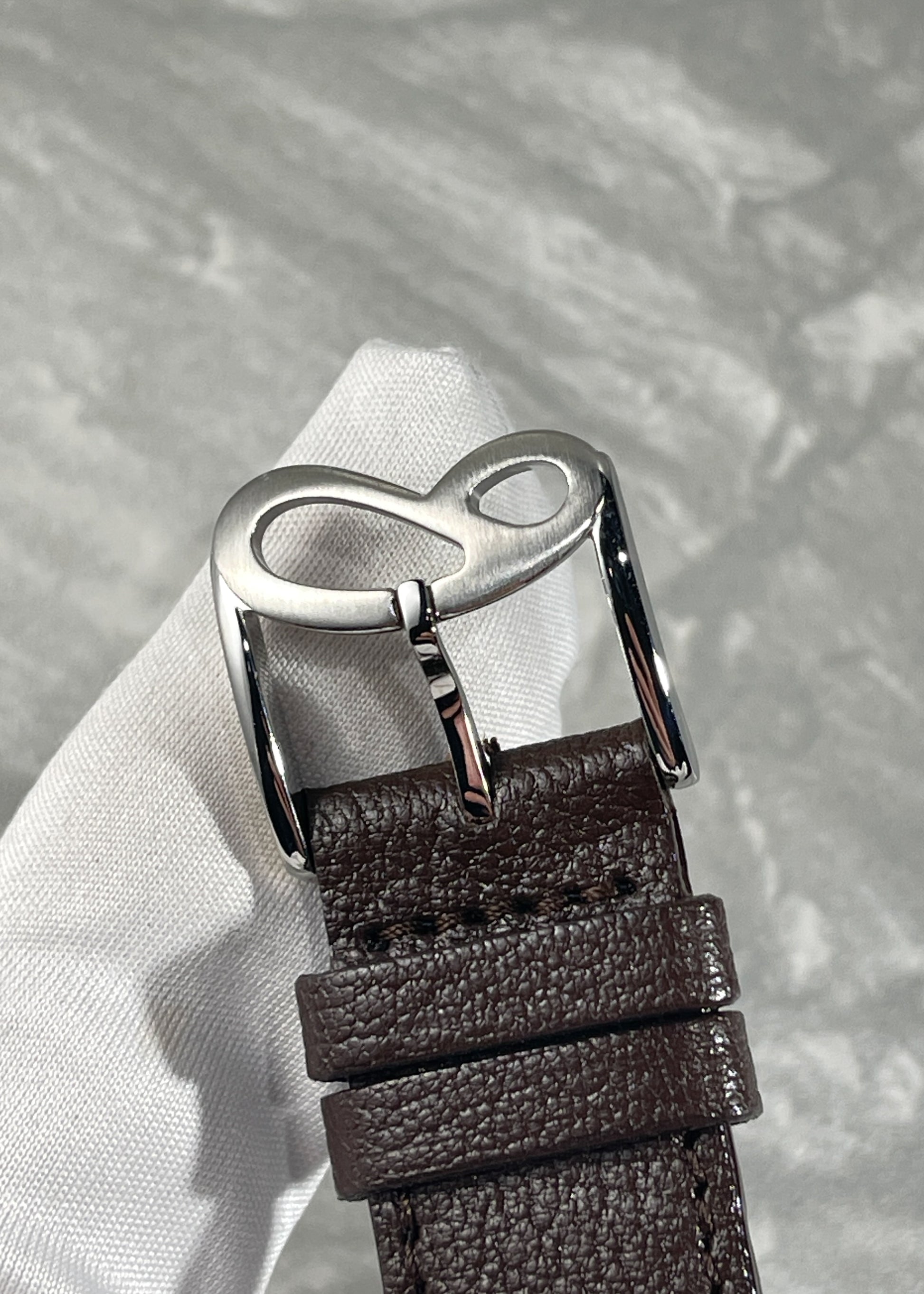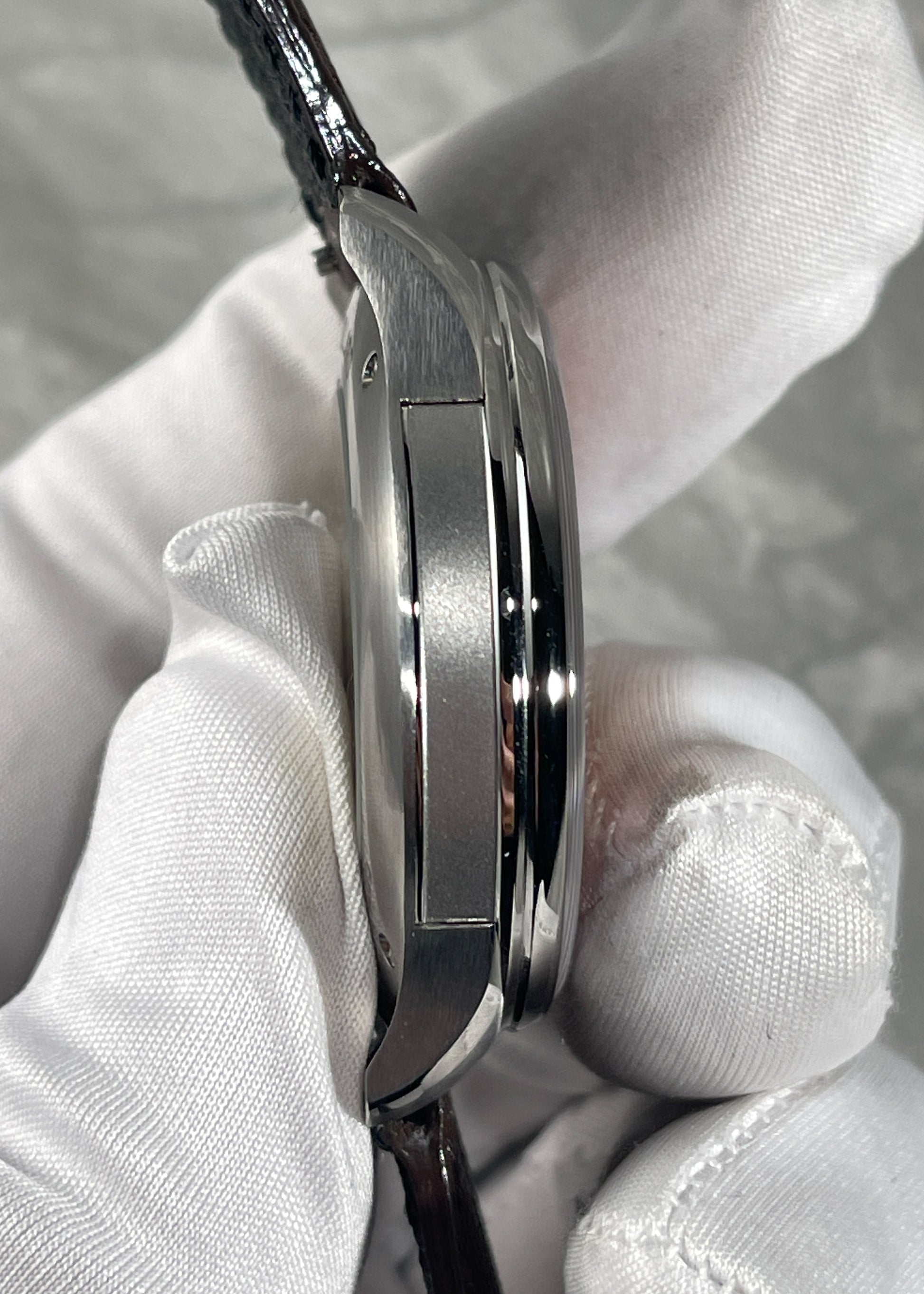 The Stainless Steel case measures 40mm x 11mm x 45.5mm lug-to-lug and is in excellent condition. Furnished on a dark brown leather strap with Sartory Billard stainless steel buckle. Complete with Box and Papers dated October 2024.