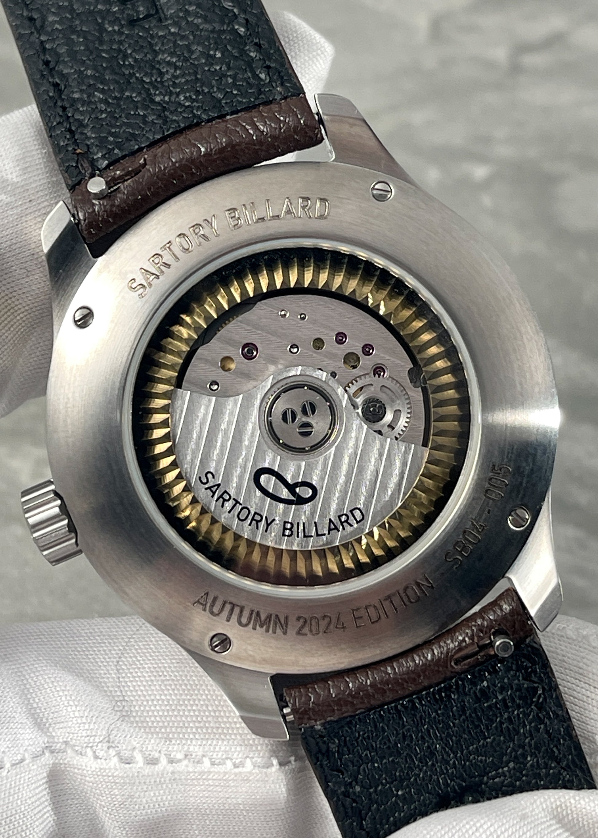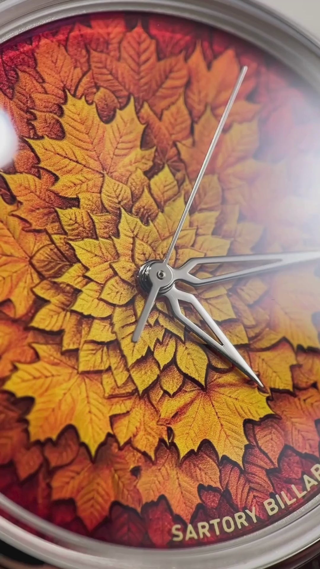 Fall in love with this Autumn 2024 Edition of the SB04 from the master of materials, Sartory Billard. The eccentric dial features a spiral of red and golden yellow leaves, each of which was meticulously embossed on a 0.8mm-thick dial using advanced 3D molding and a specialized embossing process to create a vivid, three-dimensional effect.