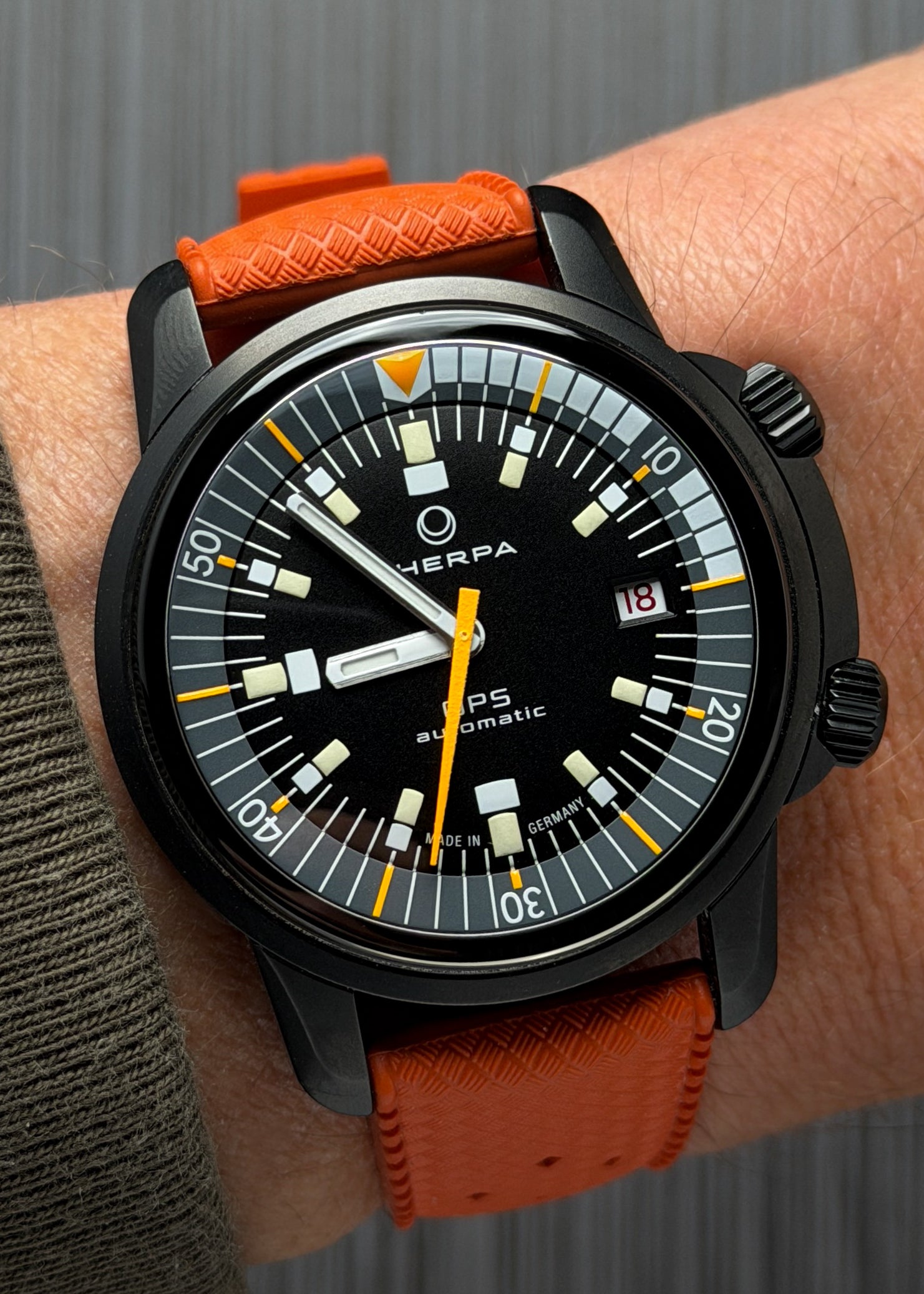 With its satin finished dark anthracite watch case, the OPS is the rebirth of a model that was favorited by several Navy Forces in the 1960s. The elegantly domed sapphire box glass with internal anti-reflex coating adds to the sleek appearance on the wrist, which enables the rugged tool watch to be worn on any occasion.
