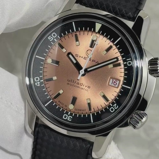 A modern take on the vintage icon, the Sherpa Ultradive has all the charm of the original with its 'double lollipop' seconds hand and robust crown guard protection.