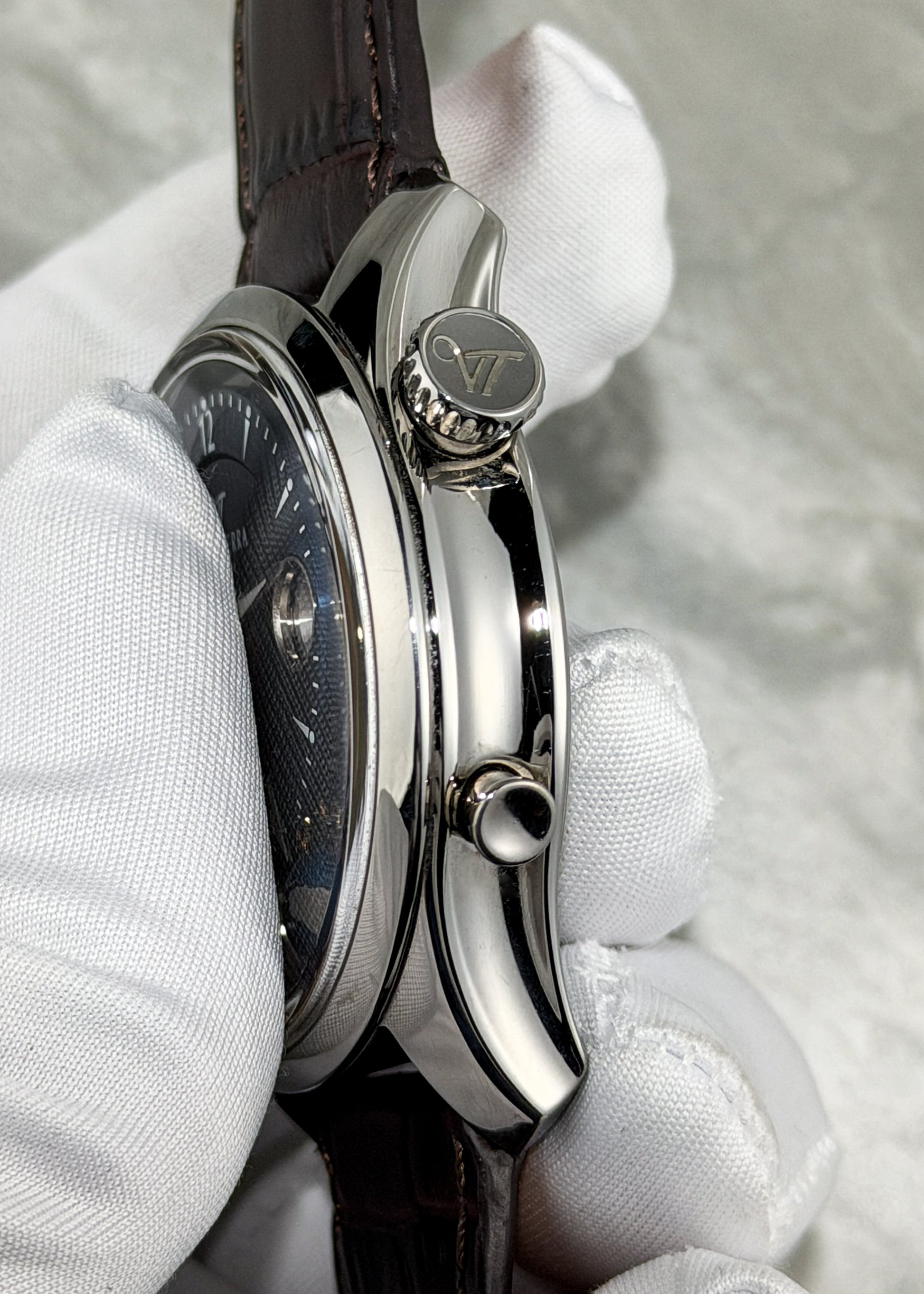 The Grade 5 Titanium case measures 42.8mm x 11.7 x 51.6mm lug-to-lug. Furnished on a dark brown Alligator strap and an Navy Calfskin strap with titanium VincenTerra titanium pin buckle. Complete with Box & Papers dated November 5th, 2018. Special Edition #4/99.